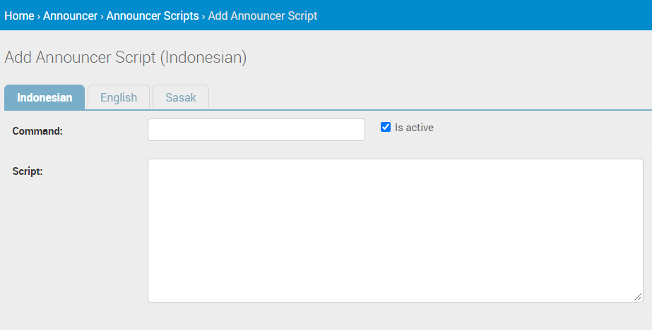 untuk menambah konfigurasi announcer script, akan muncul form seperti berikut: