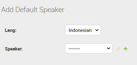 Setelah setting menu speakers seperti penjelasan di atas, dapat dilanjutkan ke menu Default Speakers untuk setting bahasa speakers. Secara default, pengisi suara dari Inalix menggunakan Bahasa Inggris dan Bahasa Indonesia, namun bisa juga ditambahkan bahasa lain misalkan bahasa daerah atau custom sesuai kebutuhan. Klik Application >> Announcer >> Default Speakers akan muncul adminsite, halaman home default speakers seperti berikut.