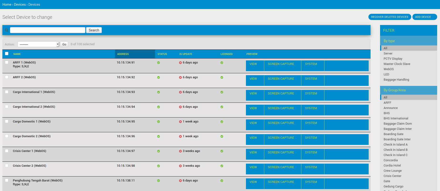 Modul Device adalah modul yang digunakan untuk monitoring device FIDS, baik itu monitoring tampilan atau system reboot, refresh atau action sytem lainnya. Akses Applications >> Devices >> Devices, akan masuk ke halaman home device