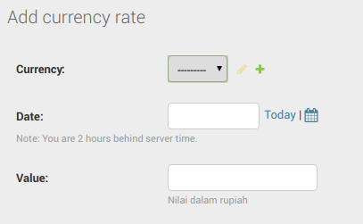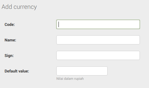untuk menambahkan mata uang baru, atau klik salah satu mata uang untuk edit mata uang yang sudah ada, maka akan muncul form pengisian currency sebagai berikut: