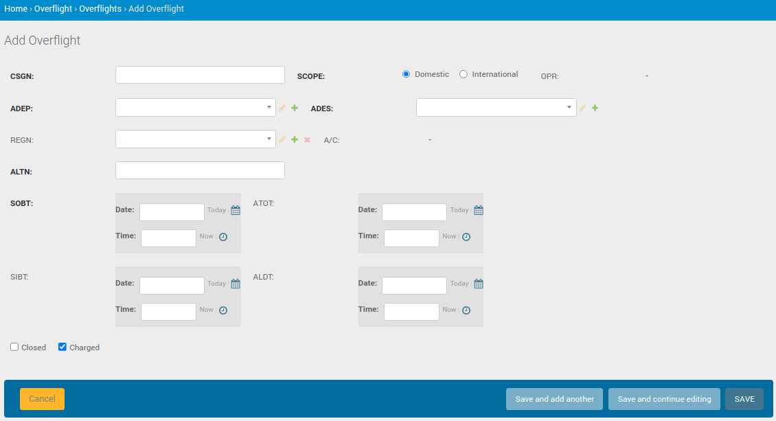 Klik tombol add overflight pada halaman home overflight untuk input data overflight secara manual, akan menampilkan form seperti berikut.