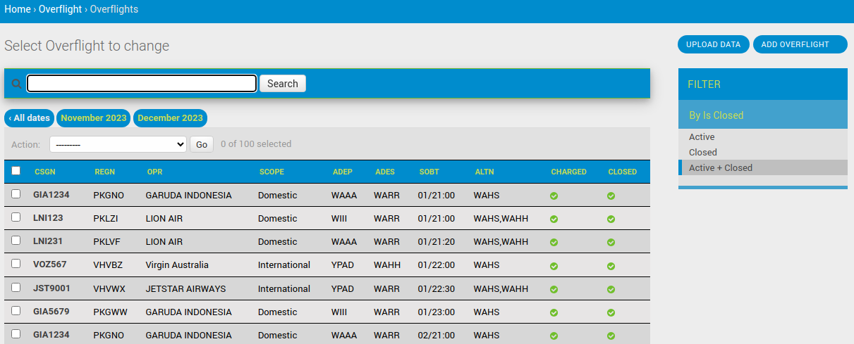 closed: centang hijau artinya overflight closed, silang merah masih aktif. closed otomatis ketika aldt lebih dari sekarang