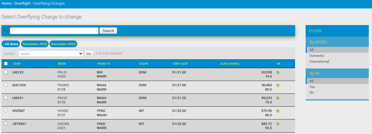Overflying charge merupakan modul yang otomatis melakukan kalkulasi charge untuk overflight. Akses application >> overflight >> overflying charge, akan menampilkan halaman home overflying charge.