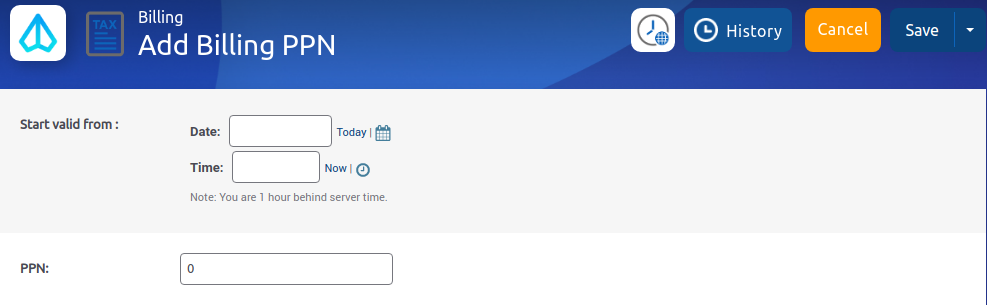 Menu untuk setting PPN dengan periode masa berlakunya. Untuk saat ini, data PPN hanya digunakan untuk modul billing cash dengan rute penerbangan domestik. Untuk mengakses halaman menu ini dapat dilakukan dengan langkah seperti berikut: