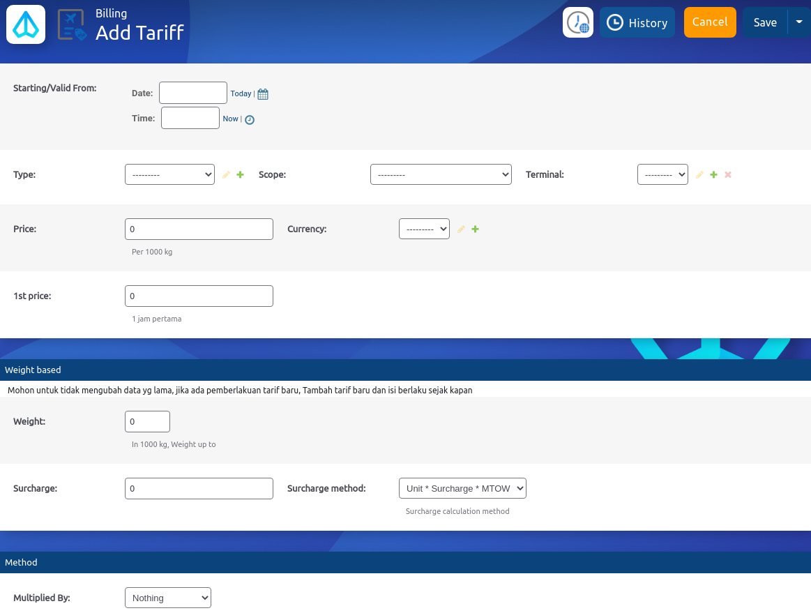 untuk menambahkan tarif baru. Edit tarif lama akan mempengaruhi laporan billing untuk flight yang telah berlalu, karena pada pengaturan edit tarif ada setting masa mulai berlakunya tarif.Edit atau hapus tarif hanya boleh dilakukan, jika memang terdapat kesalahan mengisi nominal tarif, dan pada masa berlakunya tarif ini belum dilakukan penagihan ke airline.