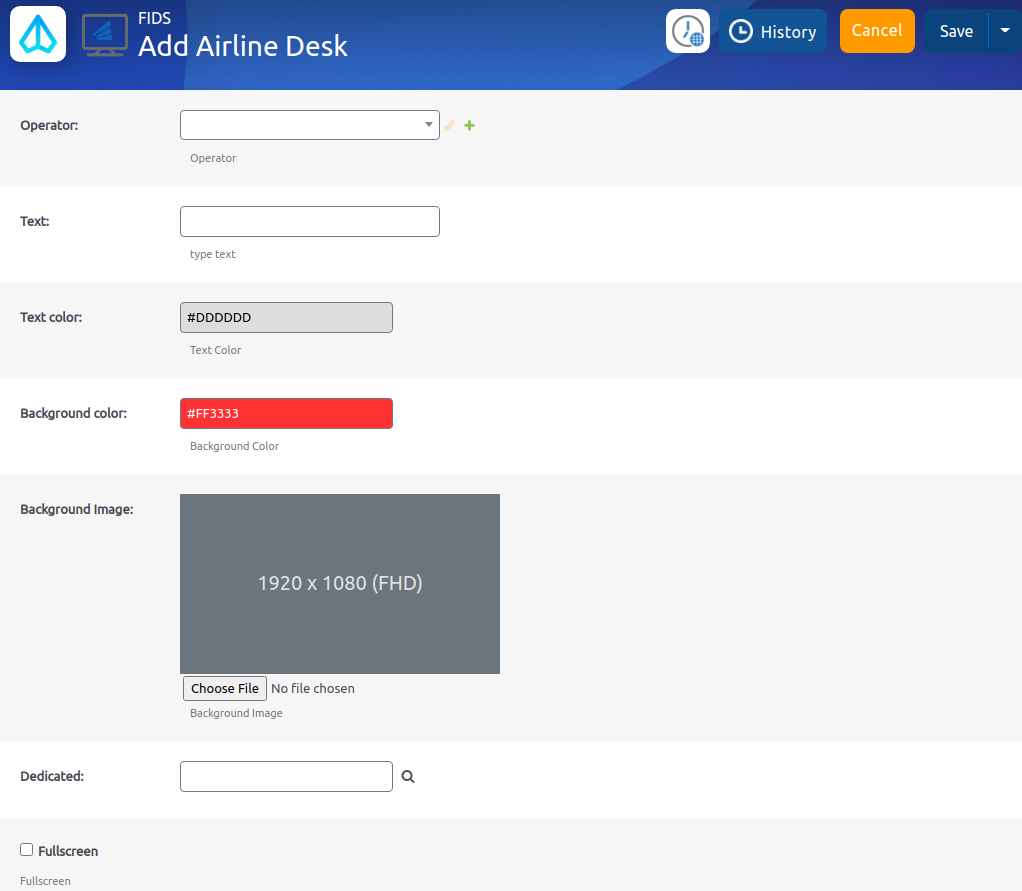 Display FIDS ini akan terreplace jika pada menu airlline desk >> field dedicated desk terisi data desk. Penjelasan detail pengisian field-field pada menu ini dijelaskan di bawah