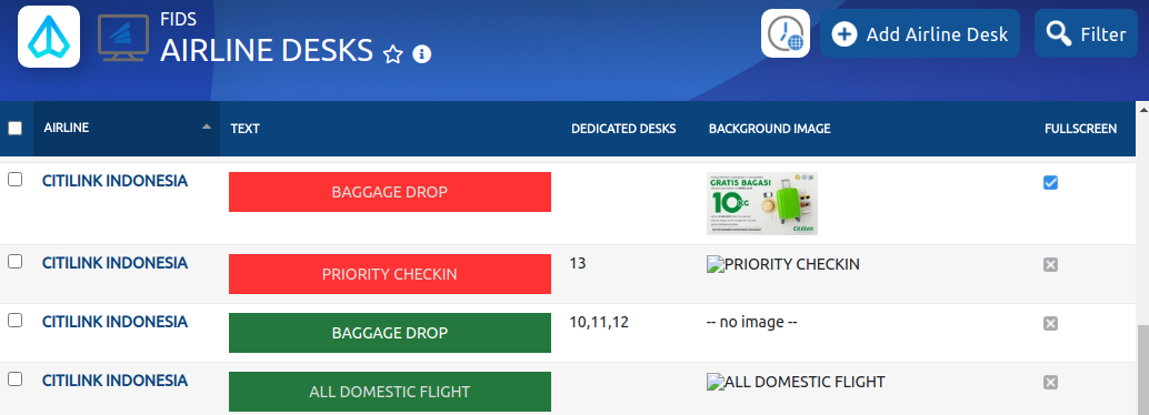 Airline desk adalah menu pada FIDS yang digunakan untuk setting konfigurasi spesial desk. Tampilan FIDS pada meja checkin counter mengikuti prioritas konfigurasi sebagai berikut: