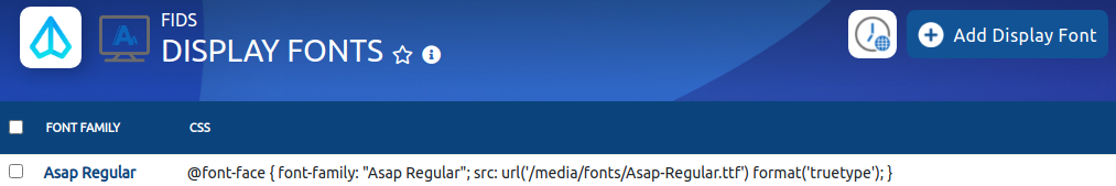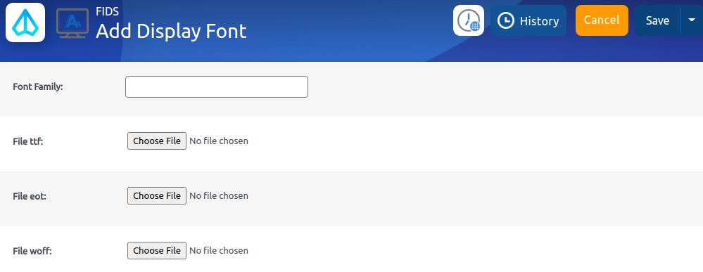 Display font adalah menu yang dapat digunakan untuk menambahkan type font yang digunakan untuk templating FIDS. Abaikan menu ini jika ingin menggunakan type font default yang sudah disediakan sistem X-FIDS. Jika ingin menambahkan font, setting utama menu ini adalah upload file ttf, eot, dan atau woff sebagai master yang menentukan font type
