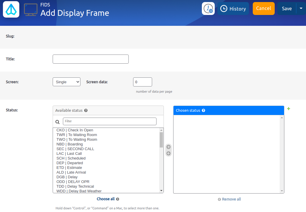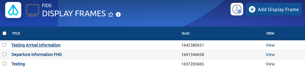 Display Frame adalah menu untuk membuat template custom pada sistem X-FIDS. Hasil templating akan ditampilkan untuk device tertentu berdasarkan pengaturan pada menu Device. Penjelasan detail tentang implementasi custom template X-FIDS pada device dijelaskan lebih detail pada di sub bab device. Ada 2 langkah utama membuat custom template: buat (add) display frame pada modul ini >> klik view akan masuk ke halaman FIDS Editor.