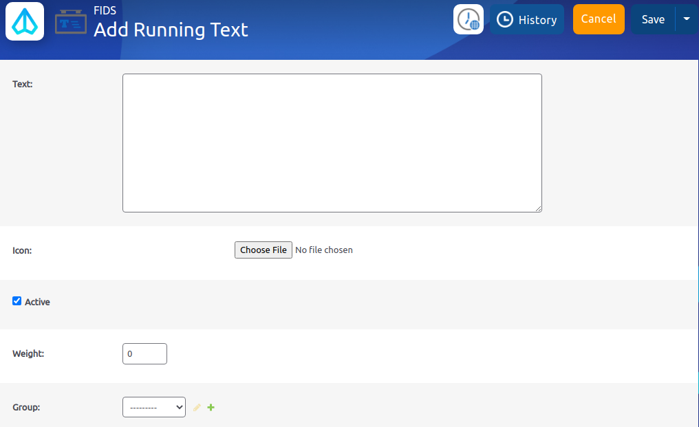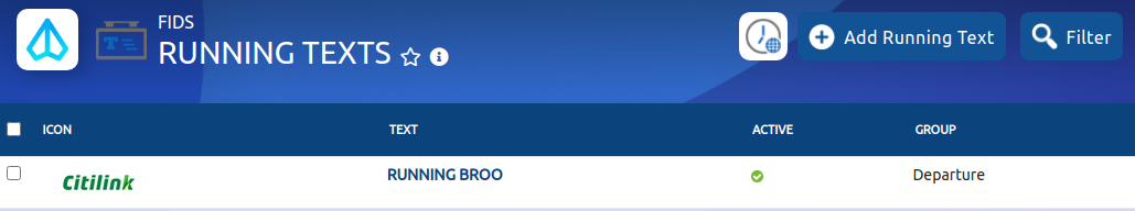 Running text adalah tulisan berjalan yang dimunculkan di FIDS, biasanya dimunculkan di bawah, berguna memberikan informasi penting ke penumpang yang ada di bandara. Menu running teks digunakan untuk input redaksi running teks. Running teks pada sistem ini dapat berupa teks atau gambar. Untuk masuk ke menu ini dapat dilakukan dengan langkah seperti berikut: