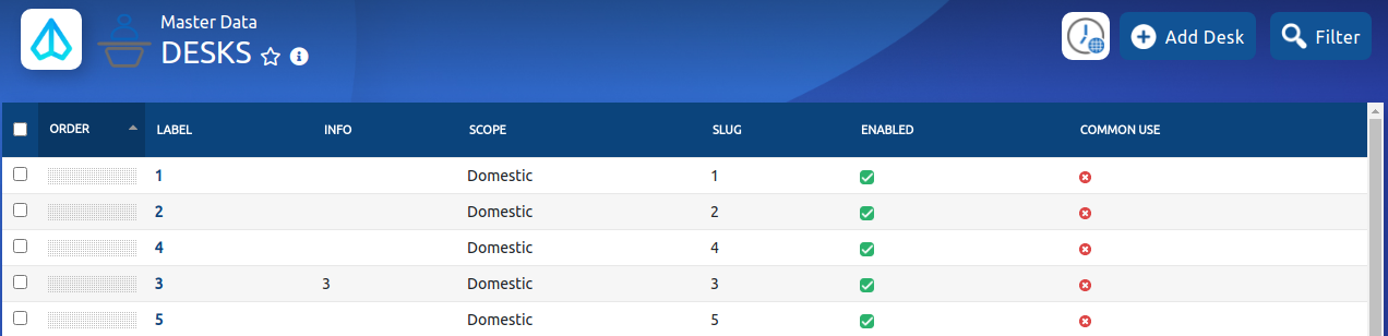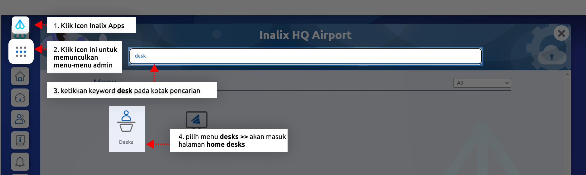 Desk merupakan resource yang berada pada checkin counter yang digunakan penumpang saat melakukan checkin untuk mendapatkan boarding pass. Pada desk terdiri dari meja dan display yang menampilkan informasi desk dan penerbangan check in yang menggunakan desk tersebut. Master data desk yang tersimpan di modul admin inalix apps meliputi field order, label, info, scope, slug, enable, dan common use. untuk mengakses halaman ini dapat dilakukan dengan langkah seperti berikut: