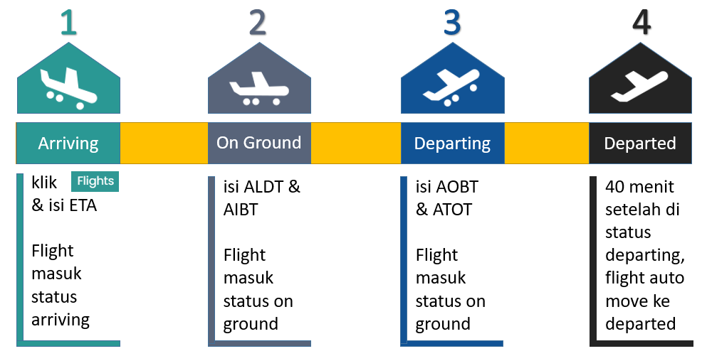Gambar di atas adalah workflow detil penggunaan dan input data flight pada ATV, termasuk ketika ada special case seperti RTA dan RTB. Untuk kondisi normal, petugas bandara dapat memahami terlebih dahulu timeline sederhana seperti gambar dibawah ini. Timeline pengisian berikut dikelompokkan berdasarkan status flight mulai arriving, onground, departing, dan departed