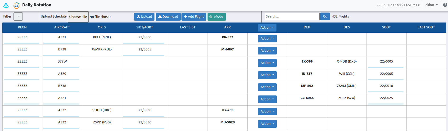 Gambar di atas terlihat modul daily rotation menampilkan flight untuk schedule besuk, dalam 1 layar langsung menampilkan flight arrival dan departure,