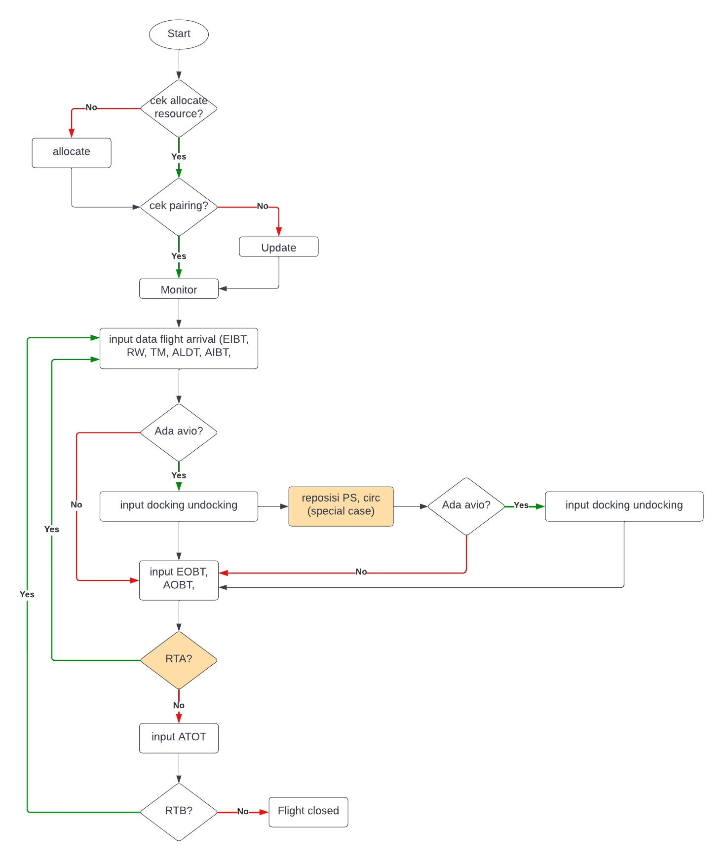 Untuk penerbangan normal, data operational flight arrival yang diinputkan meliputi EIBT, ALDT, AIBT, RW, TM, docking-undocking (jika ada aviobridge)