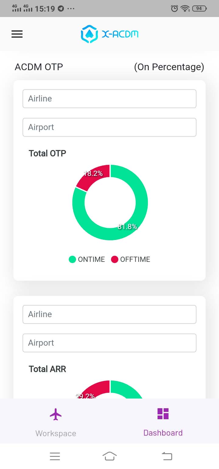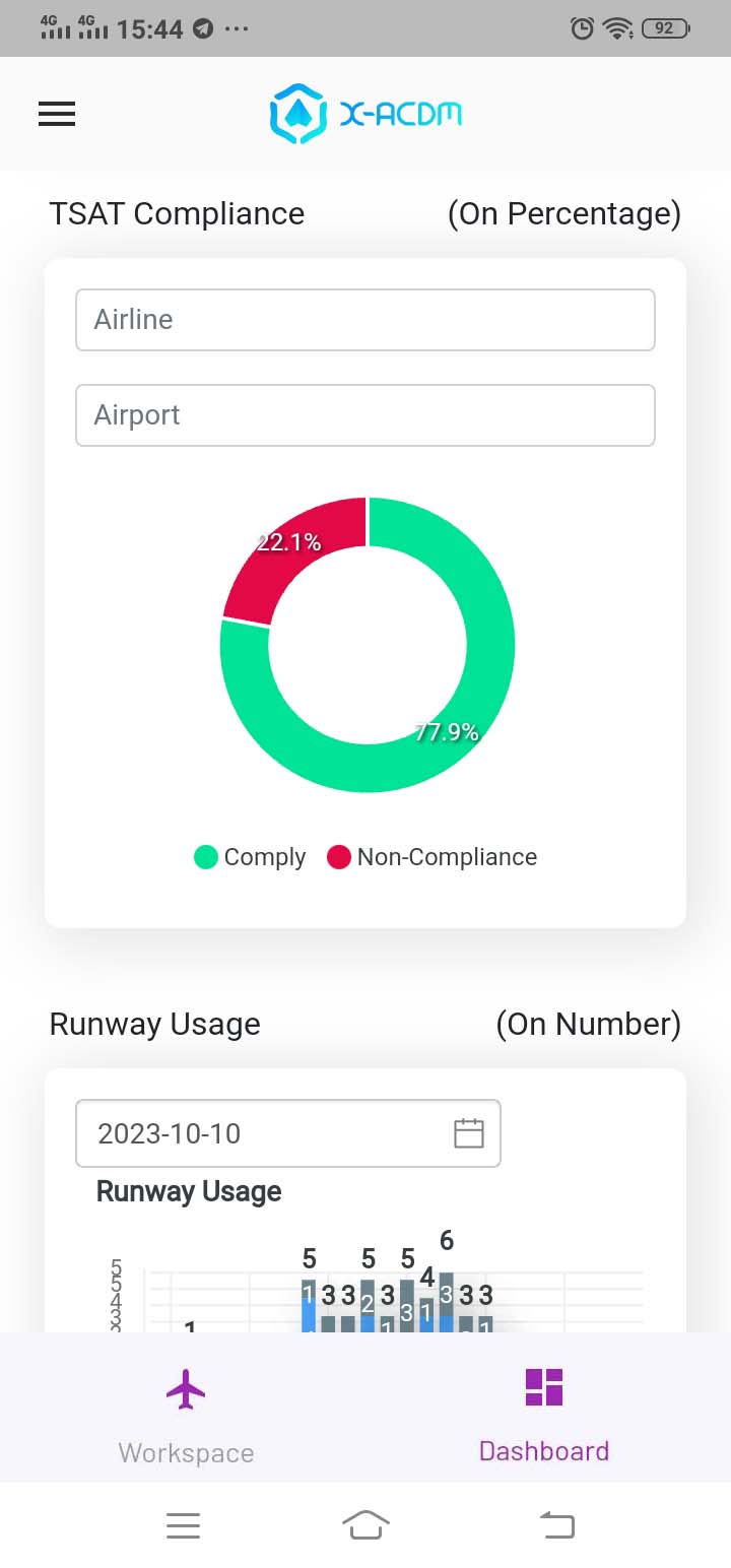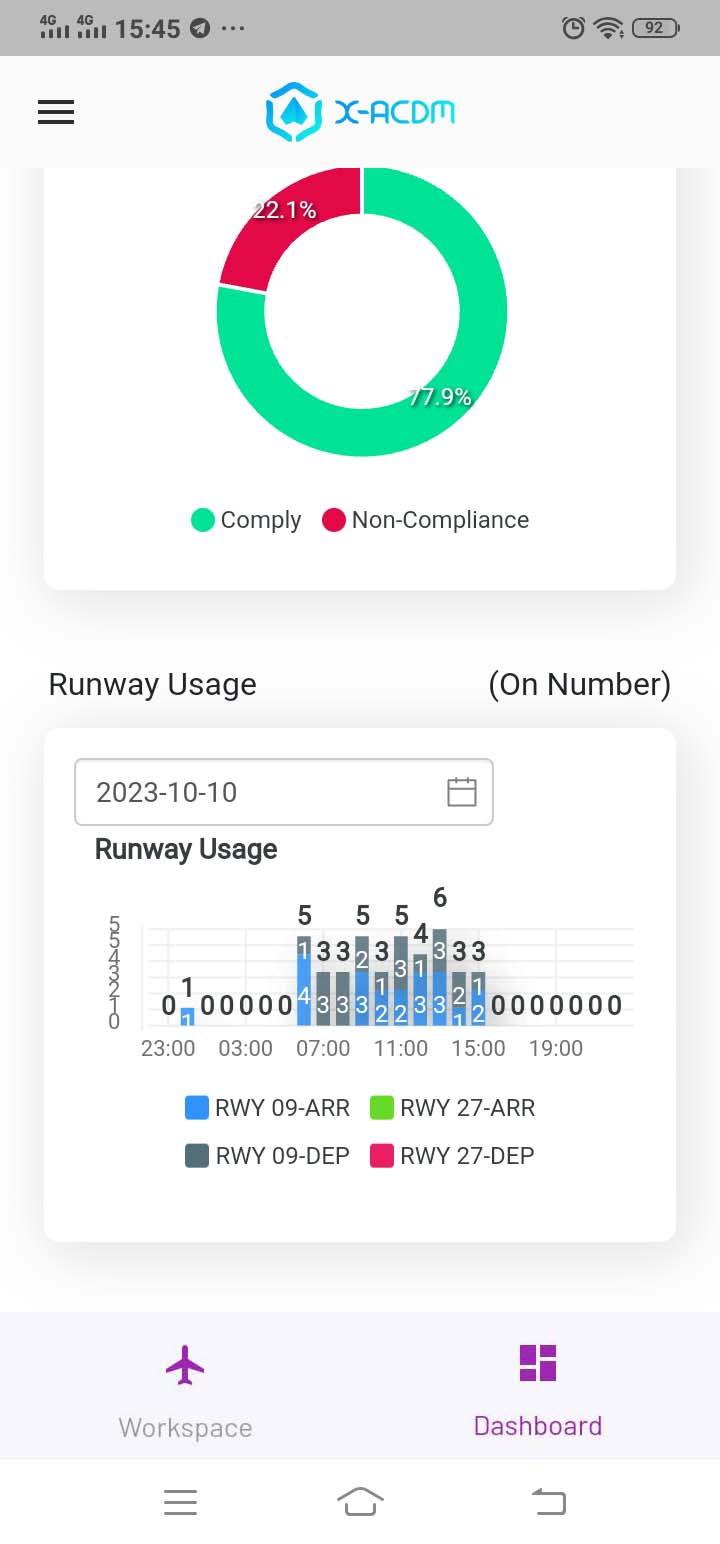 Dashboard-ACDM adalah modul aplikasi yang menampilkan data A-CDM dalam bentuk diagram dan grafik guna memudahkan dalam membaca dan analisis data flight A-CDM. Berikut tampilan dalam versi mobile