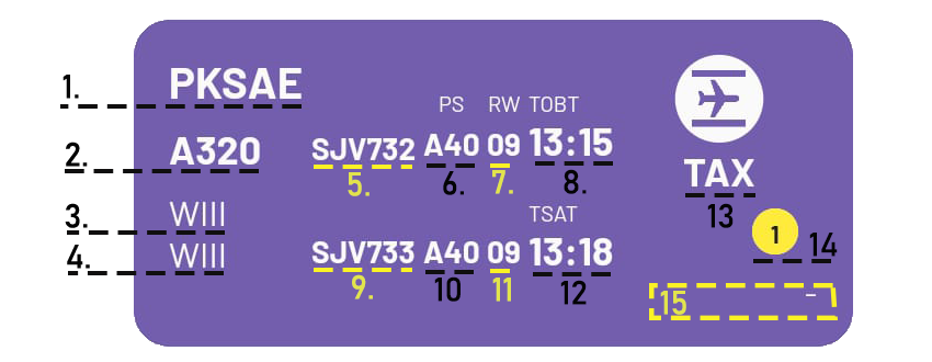 1.regno; 2.aircraft type; 3.airport (origin); 4.airport (destination); 5.flight number (arrival); 6.PSTA; 7.RWA; 8.TOBT; 9.flight number (departure); 10.PSTD; 11.RWD; 12.TSAT; 13.status (taxi in); 14. allert; 15.operational user remark (no remark)