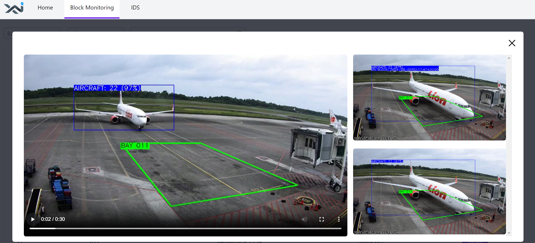 Seperti yang sudah dijelaskan pada bab sebelumnya, block monitoring adalah bagian dari product X-AI-vision dengan fungsi utama untuk mencatat waktu block on dan block off secara otomatis. Dengan mendapat input data video real time dari cctv yang ada di apron, block monitoring akan mendeteksi semua pergerakan pesawat mulai datang sampai meninggalkan apron. Saat pesawat memasuki area parkir, block monitoring auto record waktu block on dan block off. Selain mencatat waktu block on dan block off, aplikasi akan merecord video gerakan pesawat 15 detik saat mau block on dan 15 detik setelah blok off yang dapat digunakan untuk kebutuhan investigasi.